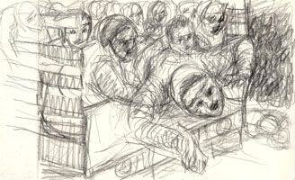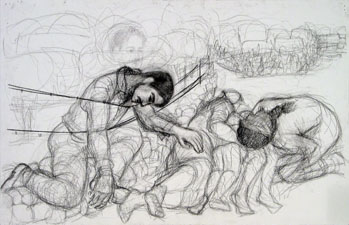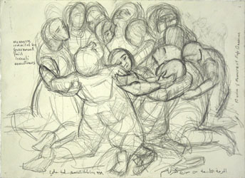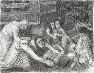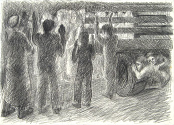The Israeli men begin shooting at the Palestinian women and the women sought comfort in each other. Then something happened which affected everyone. The women grouped together into one embrace and began to slowly turn as the bullets struck them. The Israeli men were without merci, bent on killing each and every one, leaving no wounded. According to Kafr Qasem residents, the 16 year old Hana Amer was in the middle and could hear the bullets thudding on the women. One after another the women and girls all fell in one place at which time Hana, wounded and bleeding fainted. There she remained till the following day when she spoke up as they were removing the dead. Sometimes, I think about these wounded victims who spent the night bleeding among the dead bodies of their family and friends. I consider how those hours etched themselves in momories, changing for all their futures the way they perceive their painful exhistence in the reality of Israel and the Arab states. In my drawing of the embrace before death, I draw Kahmise Amer in the front She is first to begin falling. I show her wearing an abbaye, a tradition Arab coat, and her shoes fallen off her feet. Her son, Abu Butros, told me that on Wednesday afternoon when the curfew ended and they were allowed out of their homes, he found her shoes in the road along with pools of blood and other scattered possessions of the departed.