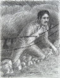 Watching the women be killed in this cold manner affects the wounded Ibrahim Masarwa beyond what he could bear. He struggled with his wounds and returned to the scene of the killing, yelling and cursing the cowardly killers and challenging them to kill him also. In this representation of Masarwa, I had it on good witness that the style of the fence was barbed wire over a short stone wall. Yes, I have seen such in Palestine. Most witnesses mention the olive trees next to the road but the one photograph which is available from that period of time shows a barren place with few trees. My olive trees in the background mistakenly are a bit more lush and numerous than the one photograph indicates. Masarwa's face is a likeness taken from his passport photo published in a kafr Qasem magazine.