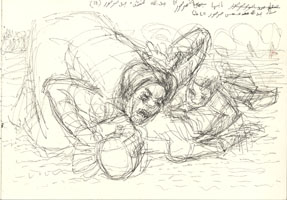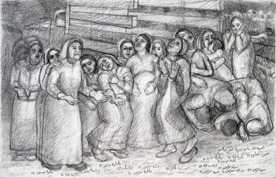 “Those Who Were Killed in the Ninth Wave of the Massacre”The ninth and final wave of killing of the Kafr Qasem massacre of 1956 affected everyone who heard even a small part of its details. Perhaps it is the coldness or the killing and quantity of the dead, or the fact that it was mostly girls and women. Some of the women were pregnant and one was in her ninth month. But, it affected no one as deeply as those wounded survivors who had to watch helplessly.I will tell the story of the ninth, most painful wave of killing, strictly on the witness of what I read, heard, and recorded. The more I work on the subject, the more I draw, and the more I delve, the more anguished I feel. Kafr Qasem becomes Palestine and all the pain that has been poured down our throats throughout my life. Kafr Qasem becomes Iraq and Afghanistan. Kafr Qasem becomes Lebanon and Gaza, and all the pain now being pushed on us this month of July and into August of 2006 as the US, Israel, and the UN conduct genocide in Lebanon, beautiful Lebanon.
