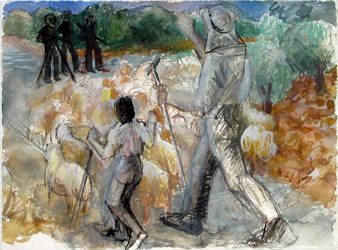MEMORIAL on the 50th Anniversary of the Kafr Qasem MassacreThe Third Wave of the MassacreTestimony of Abu Butros Amer known as Lamumba Kafr KasemInterview with Abu Butros Amer who was a witness to part of the massacre. Abu Butros was ill at the time of the interview and needed to lay down several times. He died a few years later. I recorded this testimony in Kafr Qasem on November 8, 1999 at his home.* After I told Abu Butros that I was interested in details and in the historical facts not in fiction he told me that he himself has no respect for those who invent out of their own minds. After hearing his testimony, I resolved to redo this watercolor below based on earlier limited knowledge.
