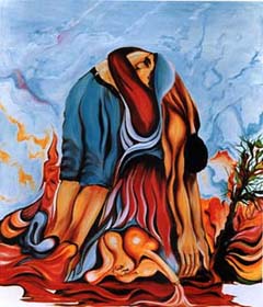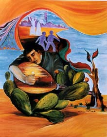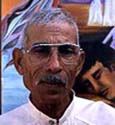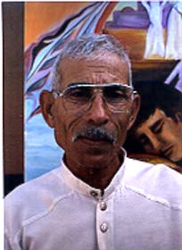 I first met artist Abdel Tamam in Kafr Qasem on the day of the memorial march honoring the victims of the 1956 massacre. It was at the open-air exhibition of his work at the Town Hall. As he stood in front of his paintings explaining them to his fellow townspeople he exuded the pleasure of standing in the sun and breathing fresh air. Later while I interviewed him I could see that he is a calm and quiet man. His eyes smile but the creases at their edge remind me of the pain he has seen and suffered at the hands of the Israelis. Still yet there is something that sparkles in his demeanor. I asked Abdel Tamam where and when he was born and how he started painting. "I was born in Kafr Qasem in 1944. I began drawing as a child using chalk and pencil. I started in the late sixties. Maybe it was 67 or 68 because in 68, 69,and 70 I was in prison."