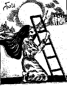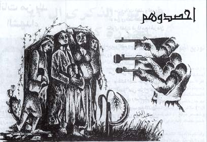 "Harvest Them" was the call used by the Israeli executioner when he gave the order to his men to open fire at unarmed workers returning home from work, anticipating a peaceful night of rest." It is interesting that Abdel Tamam does not give the Israeli executioners the dignity of having heads on their shoulders in this drawing. I asked Abdel Tamam if he ever studied art. He said: "I did a course in 1972. I could not take the certificate because the Israeli mukhabarat (secret service) threatened me." I asked him how they knew that he was doing the course and he responded that they watch us all the time and know all that we are doing. He continued: "The course was in Tel Aviv in a place called Studio Cesar. They taught me graphic design. I went for seven months. I only gained from them my own self confidence. They assigned us design projects and I was successful in these projects." Then Abdel Tamam proceeded to describe the assignments in surprising detail, revealing a crisp memory for events and details and a power of accurate description.
