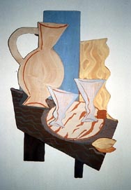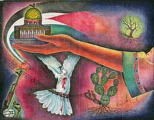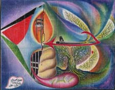 Zuhdie Al Adawi and Muhammad Al Rakoui are both Palestinian artists who were freedom fighters. Adawi spent 14 years at Askalan prison and Rakou spent 13 years at the same prison. They became familiar friends in prison and developed their art there. They both live in Damascus and continue creating art. In both the works above, ideas are narrated through symbolic imges. Each image is chosen for its meaning and combined for the way it would enhance and add to the idea of the picture. Images are combines without regard to size and location. Ideas for discontinuity in time and location came from the radical and revolutionary art of the 20th century. Palestinian art of the political prisoner is similar in spirit and idea to the art of the Mexican muralists such as Diego Rivers, Sequiros, and others.