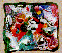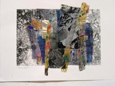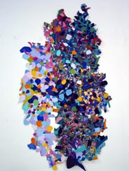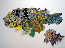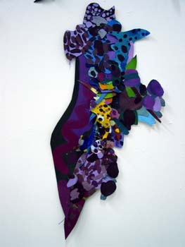 Halaby has painted on canvas with acrylics and then cut the canvas into shapes which were then sewn and glued together. Tamar prepared different papers with colors and textures and then collaged them together. In both cases, the result is an abstraction which alludes to things in reality. Also, both works result in a picture plane that is not rectangular but freely shaped according to the needs of building.