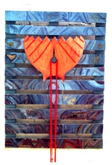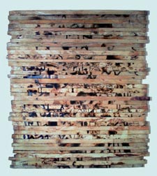 In these three works by Barakat, Kanaan, and Mansour, found wood has become the basis for different ways of working. Barakat burn images into it in a form that reminds us of ancient Egyptian pictographs. Kanaan has painted on a found crate and added some specialized shape over it as a kite. Mansour used a paste t cover some of the wooden pieces.