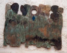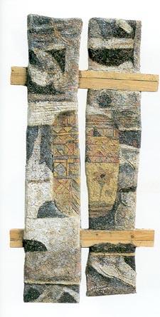 6. Sliman Mansour, untitled construction, 1992. Mud, henna, lime, watercolor on wood, 110 x 40 cm.