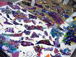 Working with colors on paper or canvas with traditional materials is also acceptable. Objects can be painted or drawn on paper or canvas and then cut to shape and stored until there is enough to assemble.