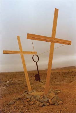 28. Ahmad Kanaan, "What About Coexistence," 1995. Wood, steel, and rope, 5 x 2 x 4 meters.
