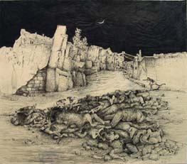 58. Adnaan Yahya, "Sabra and Shatilla," 1983. Ink on paper, 55 x 62.5 cm.
