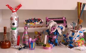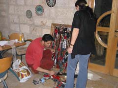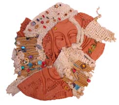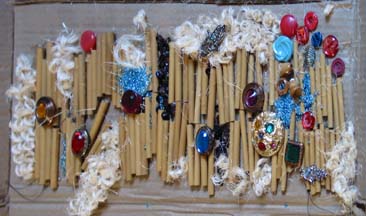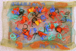 Samar Ghattas is professor of art at Bethlehem University. Like Nadira, Samar also had the pressure of exam week as she spent four days with us. A mature artist with college teaching and exhibition experience, Samar was willing to share her time with us and committed herself to try something she has not done before. During each of the first three days she assembled different materials into a piece that could have been complete in itself. Then during the final hours she put all the parts together with the determination of one who might either sink or swim. The intellectual effort was greater than at the earlier stages.