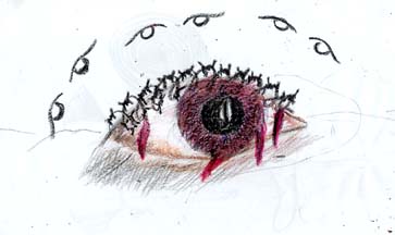 Johnie was delighted with his own break-through. I then encouraged him to try the same process not with assembled objects but with assembled images. The drawing of an eye presented below was among some of his experiments which he did not present to me. I found it after he left. Studying it one finds an impressive and mature combination of images which create a message larger than the mere combination of parts. The metaphor of the barbed wire for eye lashes which hurts and creates tears of blood is poignant and artistically mature. In Palestinian art, the eye as symbol of awareness is here used to express both suffering and knowledge of who imposes this suffering.