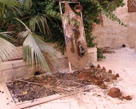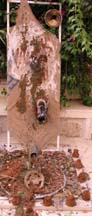 Monther Jawabrah was a practicing and mature artist who created a piece with great freedom and gusto. He collected some of the abandoned shoes he said are found everywhere. They brought with them implications of Palestinians crossing Israeli closure points. Monther put some frames, chicken wire, mud, sack cloth, mud pies, shoes, and a discarded speaker together to create his piece. The crossing of the frames speaks clearly of Israeli imposed closure points. On the vertical path are shoes marching through the mud across a horizontal pathway where mud pies symbolize the cement road blocks Israelis place in the way. At the top right corner is the rusted speaker. All the participating artists immediately recognized the symbolism of the piece and associated the speaker with the hateful voices of Israeli soldiers yelling orders in their accented broken Arabic.