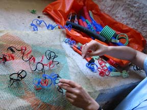 Nadira AlAraj is professor of operations management at Bethlehem University. She joined the course during a time of great pressure in her life. In addition to the difficulties created by the seige, it was exam week at her university. But it was relaxing, she said, amidst all the pressure to respond intuitively to the physical manipulation of found object and to follow the ideas they provoked in her. The experience began to suggest play and recess time. The resulting artwork is light hearted yet powerful. I look at the piece and it tells me of the delight of moving when still a child, of shapes freshly born, of flowers just after budding, of leaves in the spring, of skies and grass, and places of safety. It is a wonderful, beautiful work and I hope that she will sign and date it and take good care of it.