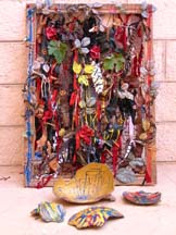 Tamer Mounir Mousa is also very young and just beginning to make art and to experiment. He is completely open to the ideas of the project and intuited immediately how to proceed. He gathered his materials quickly and spent the greater amount of time exploring these materials and resulting forms. In the end a beautiful piece with many allusions was created. It had the syntax of a window with objects on the window sill, or an alter with offerings, or a picnic on the stoop of a doorway. Tamer has wings wide open waiting for the wind to rise that he might fly.