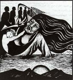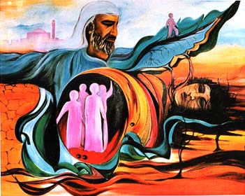 When was your first exhibition? "My first exhibition was a group show in Beit-Lahem (Bethlehem) in 1977. The Paintings were about our Palestinian heritage and I had a great response from people in Beit-Lahem. I had a painting of a church and a mosque, both broken but resting on each other, and together they formed (they appeared like) a Palestinian woman whose face showed troubles. I exhibited in Nasreh (Nasareth), in Shafa Amer, in Jaybe, and in Petah Tikvah and in Tel Aviv. In Tel-Aviv they found what I did important. The Jews, that is, they consider me the other side and that is interesting to them and they like to see the other side."
