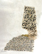 "I do a lot of installation. But always, when I find a new subject I feel that I am at the beginning of a road. I use henna because it is feminine and feminist. I was searching for a medium and found Henna wonderful and it has two colors -- green and red." Her discussion regarding materials and their importance to the expression and the content of her work is an idea that is current among many Palestinian artists.