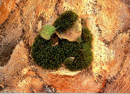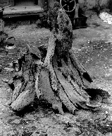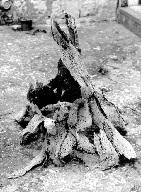 For example, in the garden of her studio she is building an olive tree from dry cactus leaves. It is an ambitious project. Looking at it and trying to explain where it is going she said: "I am born after the 'Nakbeh' but I get it all from my father and mother and my experiences from the ‘Day of the Land’ and my own continuing experience. I am breathing politics and oppression here and it confirms what my parents tell me. We experience exile right in our own land. During their 50th anniversary, Israelis invited Arab artists to participate in an exhibition at their museum. They begged me to join but I refused. I am not part of it I am the other side of the 'Nakbe.' I am trying to build an olive tree from dry cactus. After I build it as an olive tree I want to hang green cactus leaves on it like a new kind of fruit. I like not always to be political in my work and sometimes to be non-political and free. They (the Israelis) think that 'saber' (cactus) symbolizes them but I think they are stupid because they found the plant here and did not have anything to do with it in their history. Even falafel and fava they take and make them out to be as though theirs." The two pictures below are two views of this work in progress. Only the lowest part of the main trunk of the olive tree is complete.