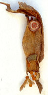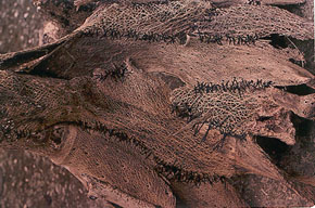 When dry and fallen to the ground, the cactus leaf quickly becomes a network of veins. It remains tough. She creates constructions with them. Often she sews them together to create illusions of other recognizable things.