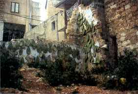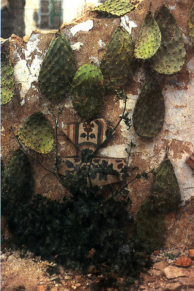 Rana uses cactus as a visual language. "Cactus is like a language for me and I seldom use it as subject for drawing but as the thing itself in three dimensions." In Haifa, she found a fragment of an old home - a wall still standing after Israeli destruction. Rana hung it with cactus leaves and between them she hung fragments of Arabic tiles often found at the site of destroyed homes. She called the work "Scream of the Valley - Wadi Al-Nisnas." She explained that Nisnas is the animal like a cat that is long in shape. And wadi means valley. The Nisnas is extinct in this valley now. Thus use of the phrase in this context is intended to describe how Arabs feel in Israel - deeply threatened. As time went by the cactus leaves sprouted and the meaning of that is not lost on either of us.