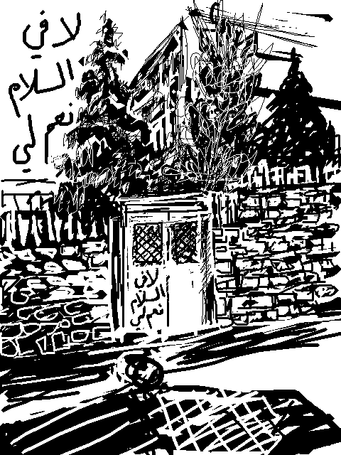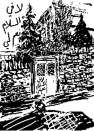 Behind his head through the windshield on a distant wall I read the following graffiti: "There is no kindness for me in this Peace Agreement."